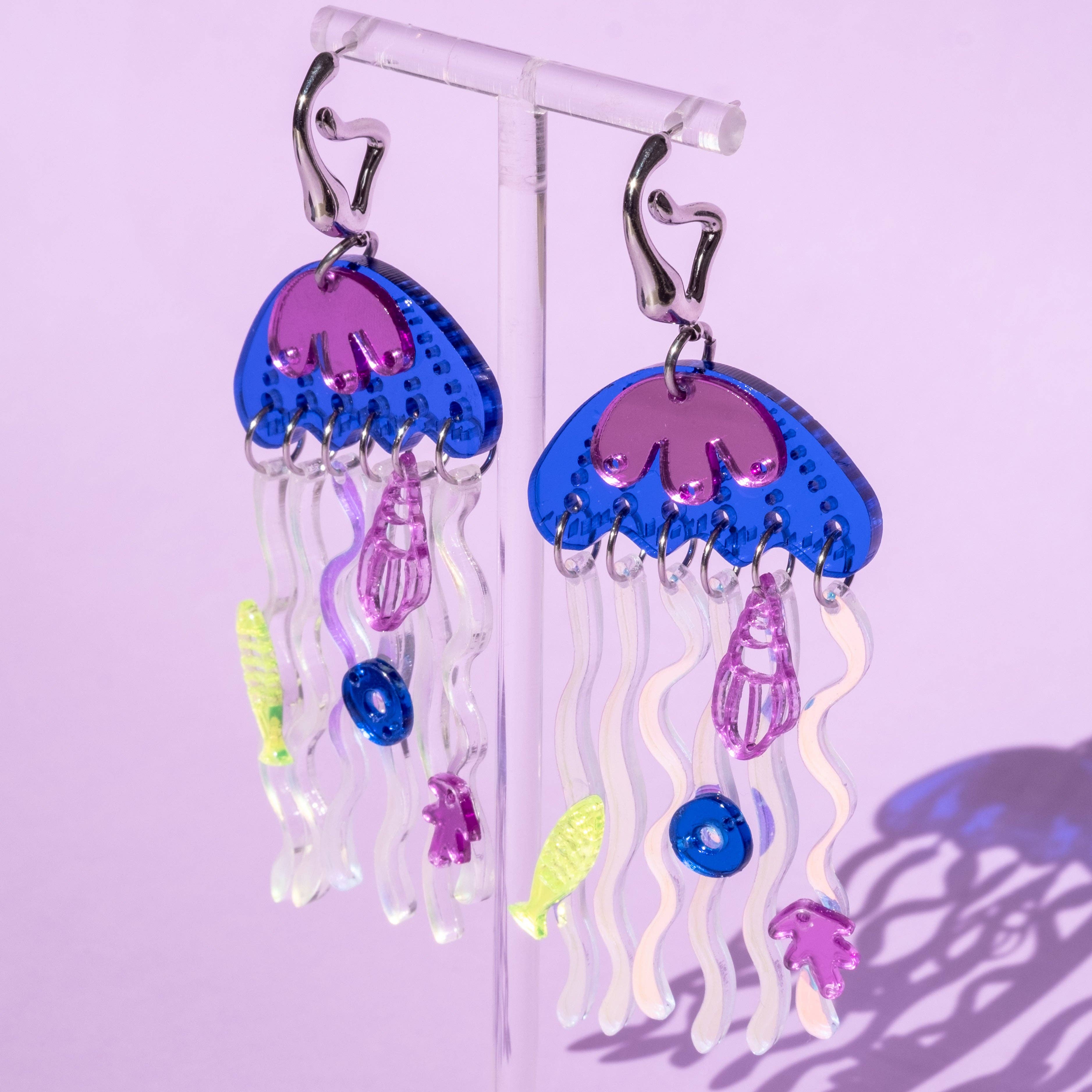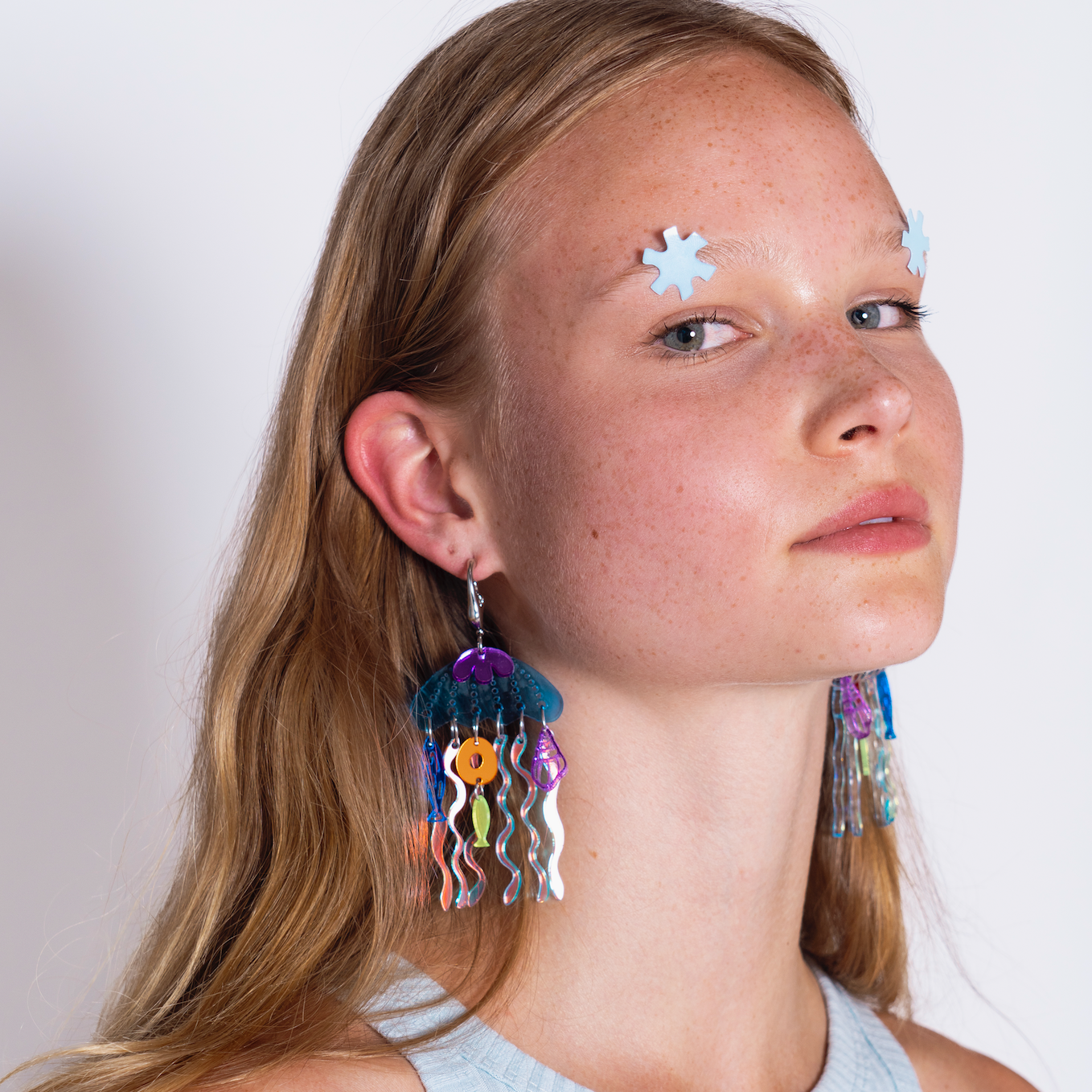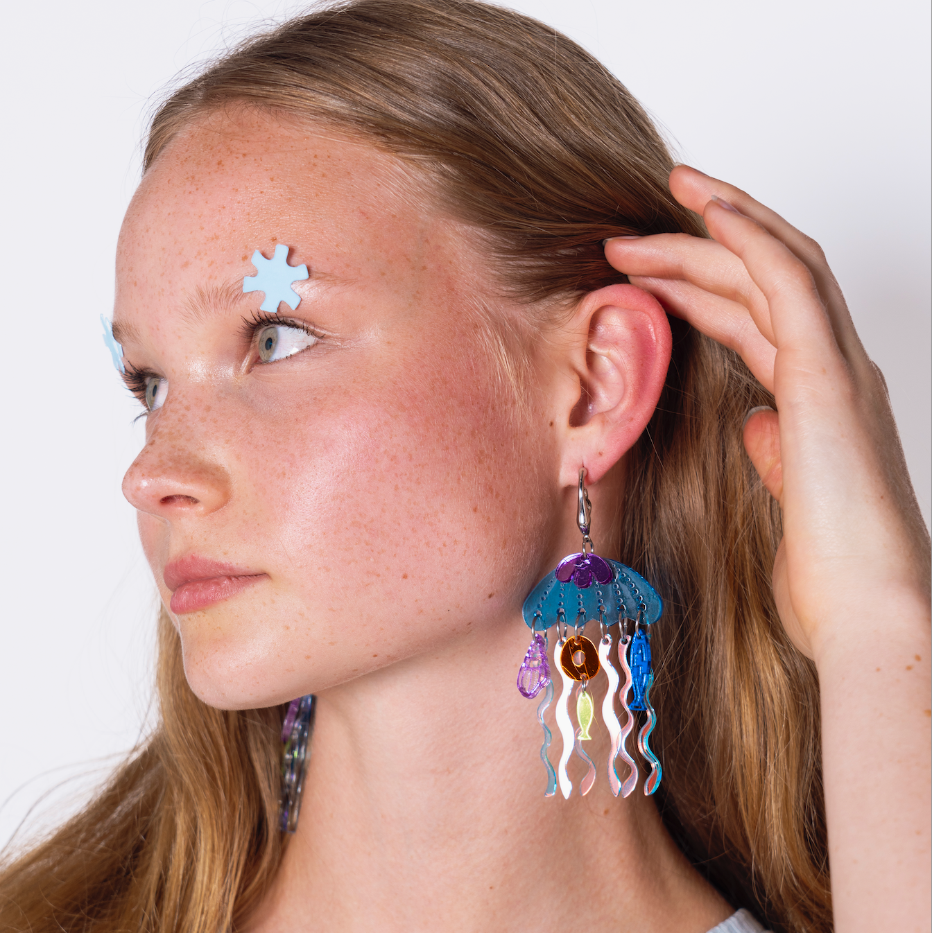 These earrings are inspired by the wibbly-wobbly shapes of jellyfish. This design features tiny handmade iridescent pieces, that look so magical when they glimmer in the sun.