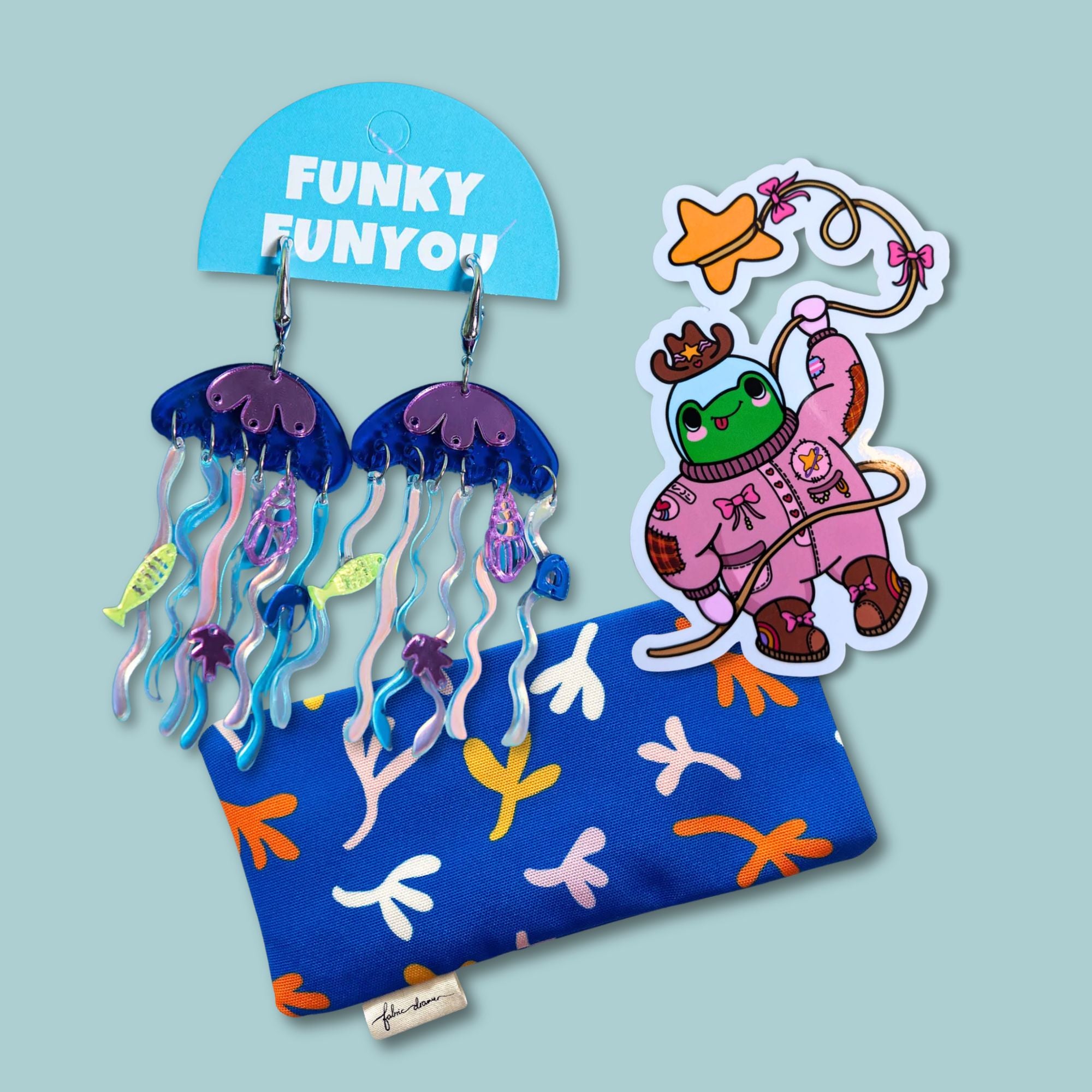 They'll receive a colourful case for their sunnies, the most amazing handmade jellyfish earrings, and the cutest froggie-astronaut sticker. Perfect for birthday, Christmas, or just because!