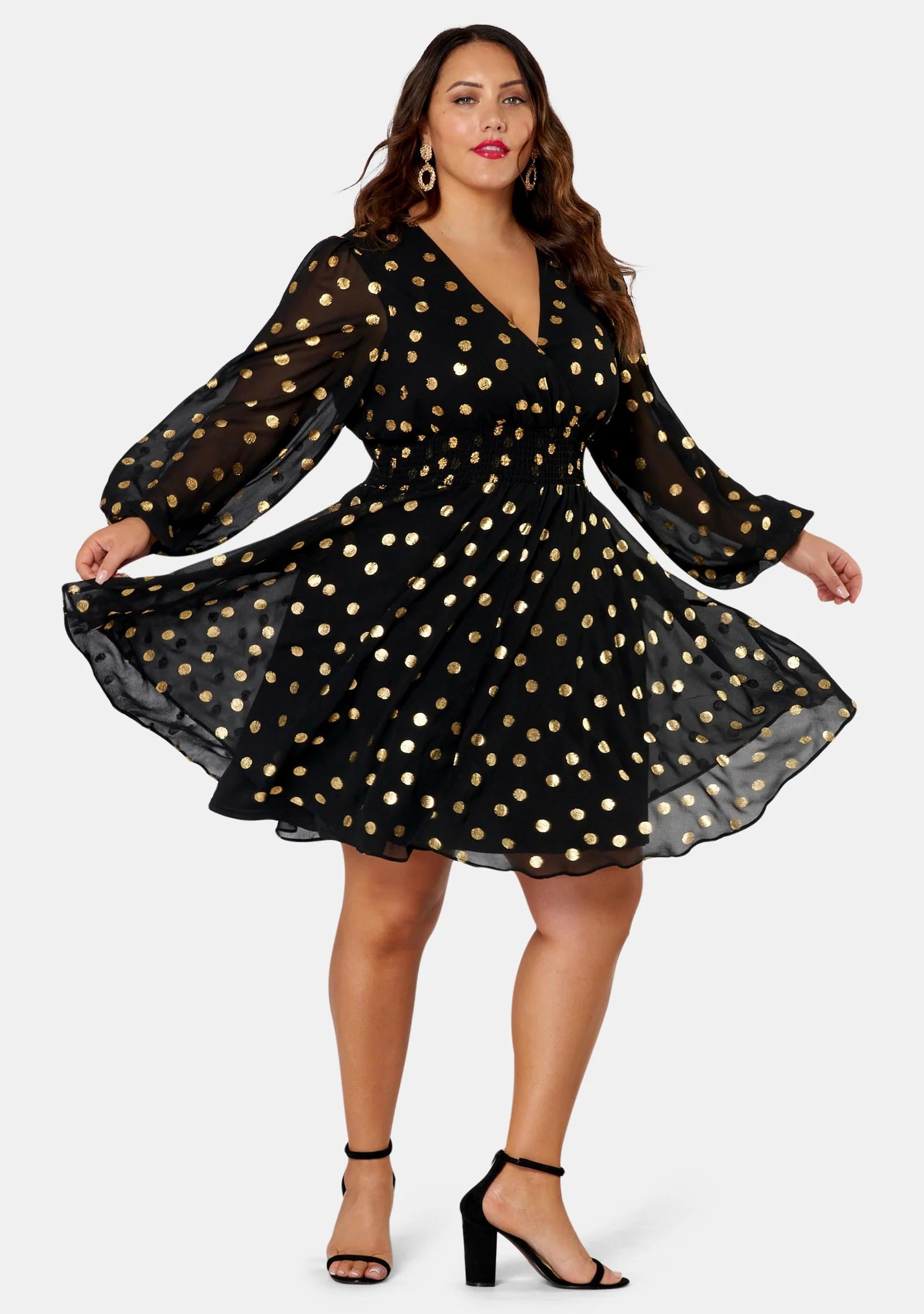 The G Spot Print Midi Dress from Curve Project's Pink Dusk pays homage to the must-have LBD. Crafted from a delicate woven cloth with gold spot design, this dress features a shirred elastic waist, flared skirt silhouette, V neckline and long sleeves for that ultimate wow factor.
