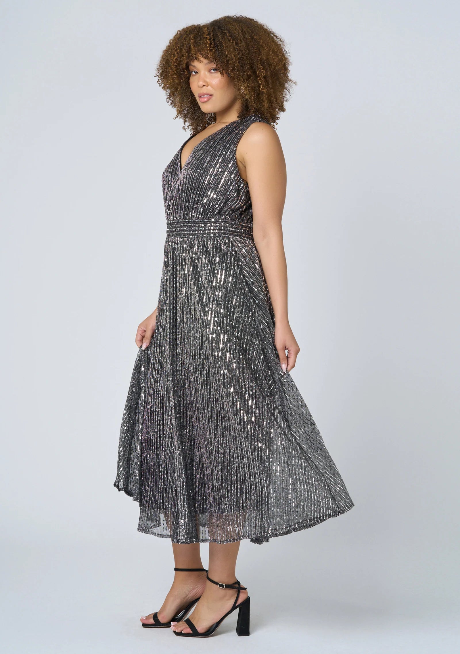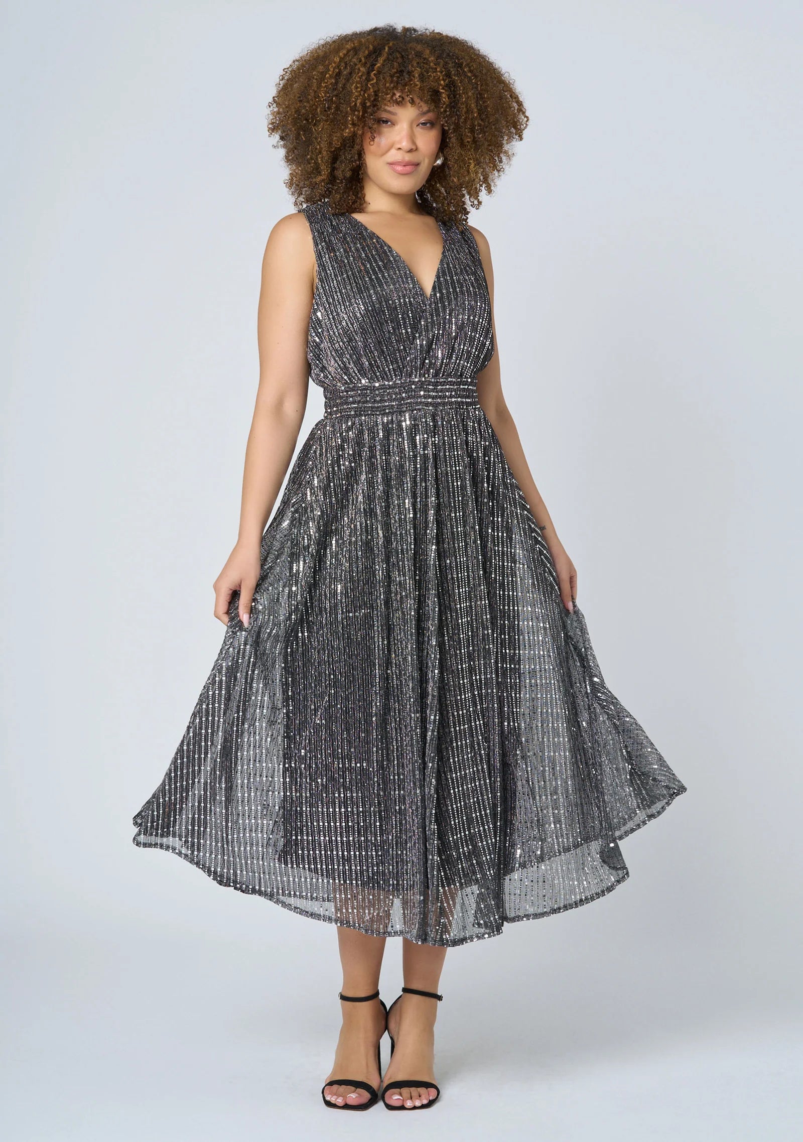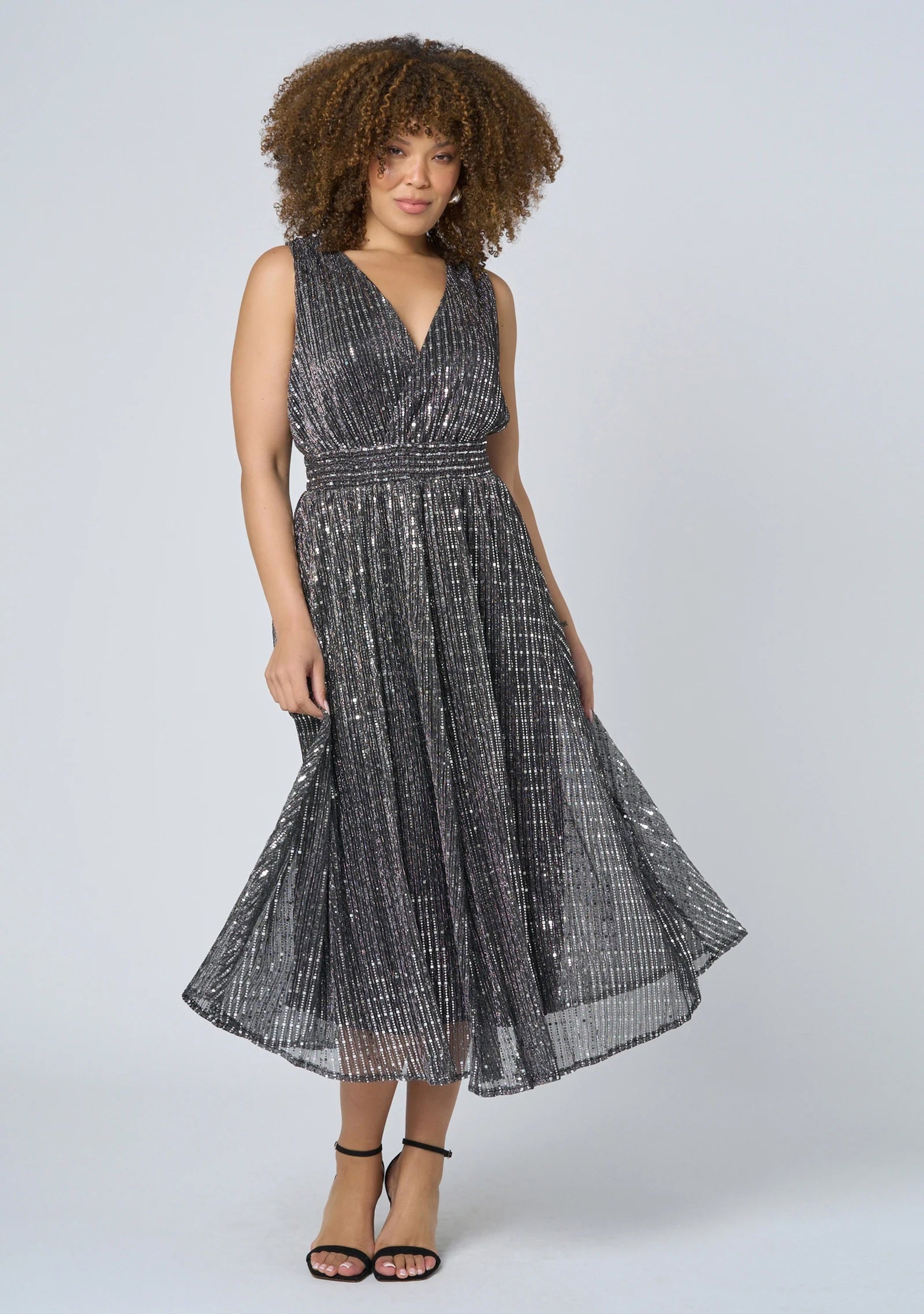 Featuring a wrap V neck silhouette and shirring at the waist that adds an element of mystery and allure to the ensemble. Perfect for a night out or a special occasion, the Sparkle Bright Midi Dress by Curve Project's Pink Dusk label stuns with its silver sparkle.
